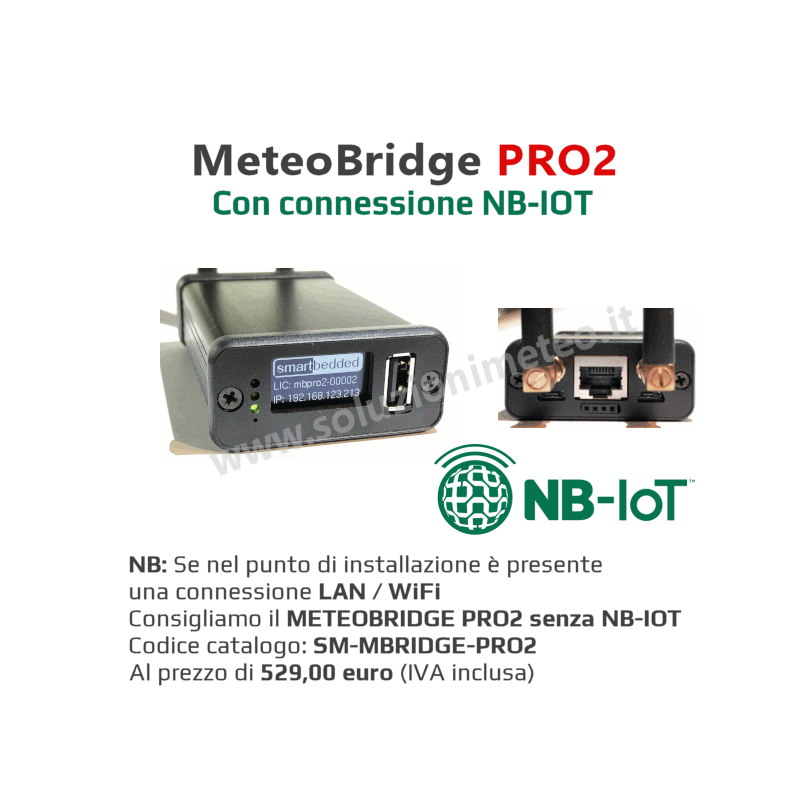 Questa particolare versione PRO2 NB-IOT include oltre a tutte le caratteristiche del PRO2, la possibilità di connettersi alla rete NBIOT. La copertura NBIOT è presente sulla quasi totalità del territorio nazionale. In punti dove non è presente la connessione internet LAN o WiFi sarà quindi possibile usufruire di questa connessione. I dati verranno inviati al cloud Meteobridge e potranno essere consultati secondo un determinato protocollo. Potrà essere inoltre utilizzato un meteobridge connesso alla rete internet tradizionale (WiFi o LAN) per visualizzare i dati come se si trattasse di una stazione locale. Dal meteobridge connesso in LAN / WiFi sarà quindi possibile ricevere i dati dal Meteobridge PRO2 NB-IOT e inviarli sul web sfruttando tutte le potenzialità che offre l'ecosistema meteobridge.